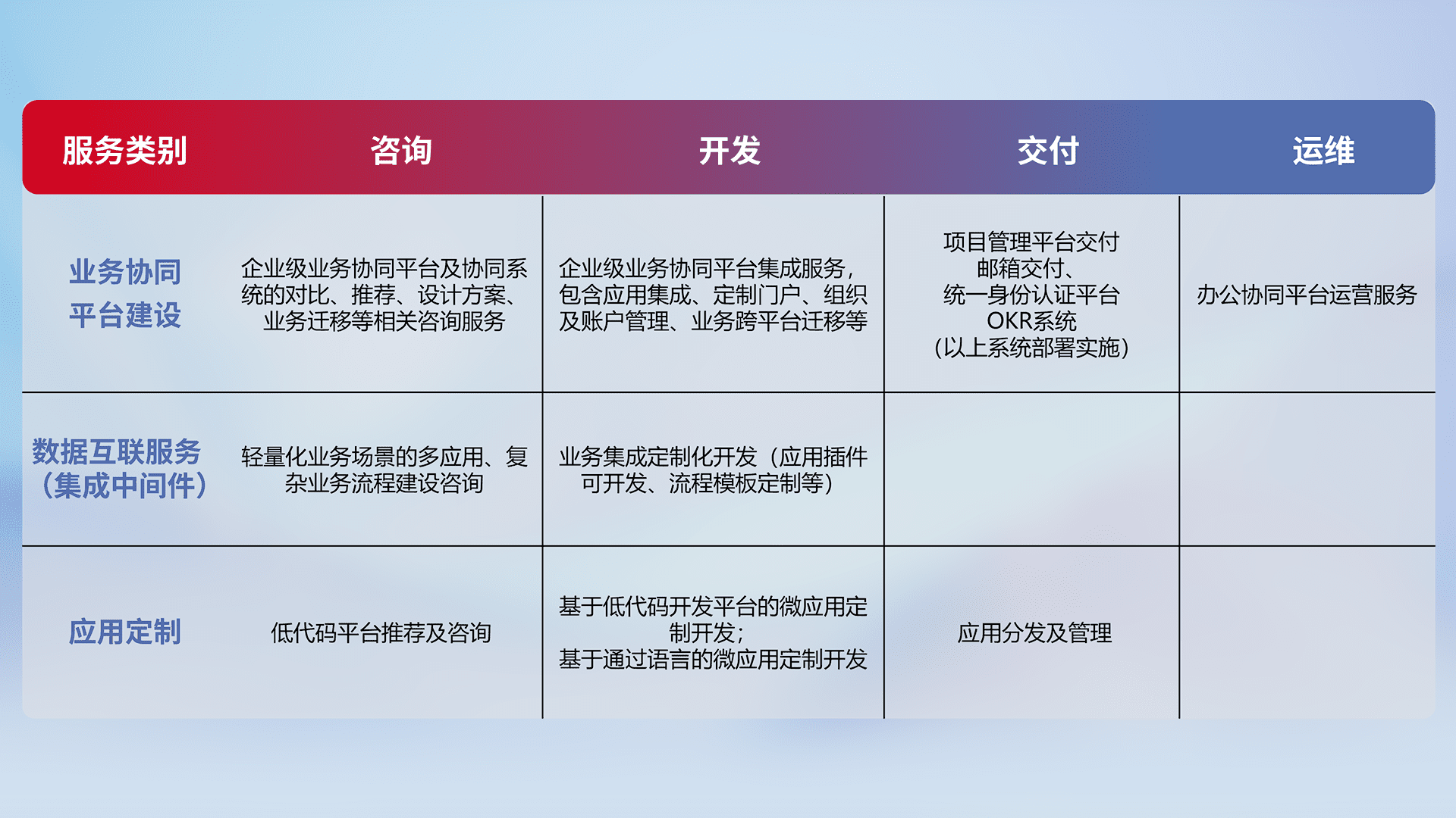 针对钉钉、、、、企微、、、IDaas等平台级产品提供产品的规划、、方案、、交付、、、定制化开发等服务,,,实现如统一协同办公、、、智能客户服务、、混合会议管理、、、、智能数据查询、、等业务场景,,,实现数字化转型。。